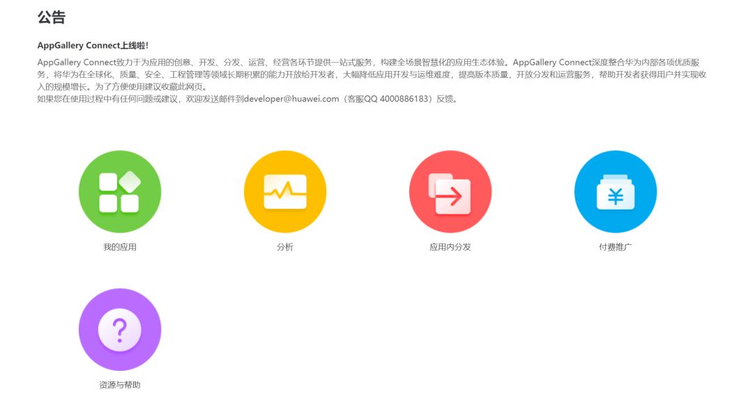 AppGallery Connect支持移动应用、快应用、VR应用及路由器应用等多种应用类型,涵盖“我的应用”、“分析”、“付费推广”和“资源与帮助”等模块,可为应用的创意、开发、分发、运营及经营等各环节提供一站式服务,全面助力开发者高效运营与持续营收。