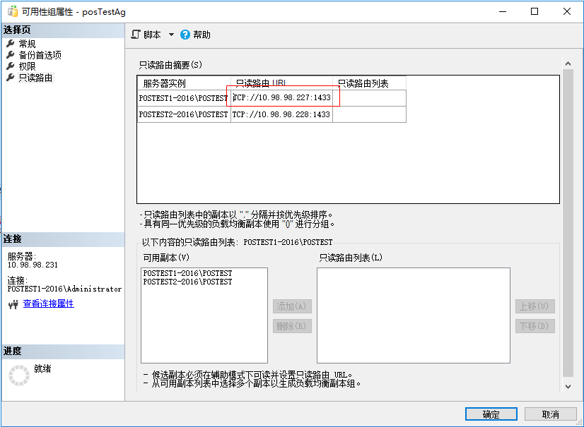 MODIFY REPLICA ON N'POSTEST2-2016\POSTEST' WITH (SECONDARY_ROLE(READ_ONLY_ROUTING_URL = N'TCP://10.98.98.228:1433'))