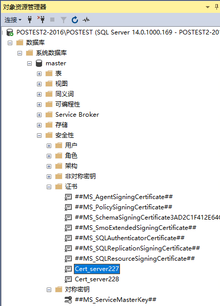但是既然节点没有加入AD,那么久不能用域认证,只能用证书认证,因此需要创建证书和端点。在配置可用性组前各节点进行证书认证信任。