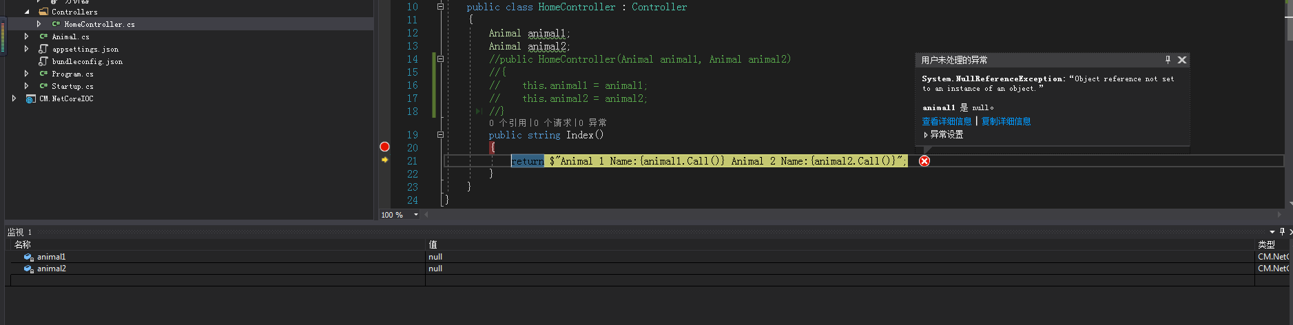 报错了,根本没有注入两个属性,怎么回事?.....不对我们根本还没注册Controller到autofac中,为什么会有对象自己生成啊,其实这里的情况是比较特殊的,如果我们这时候不是直接在Controller层做实验,其实已经完成了属性的注册了,因为这时候Controller的创建工作还不是autofac做的,从我没有注册就可以看出来,那是什么原因啊?我先注册看看