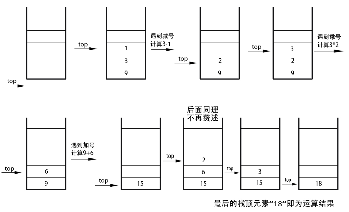 举个例子:计算9+(3-1)*3+6/2,转换为后缀表达式即为9 3 1 - 3 * + 6 2 / +(怎么转换后面再讲)。计算规则就是建立一个空栈,遇到数字就入栈,遇到符号就以符号前面的两个数为运算数进行计算。