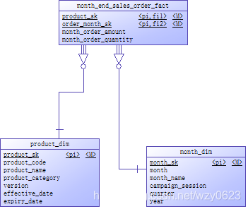 只要将年、月参数传递给这条查询语句,就可以获得任何年月的统计数据。但即便是在如此简单的场景下,我们仍然需要建立独立的周期快照事实表。事务事实表的数据量都会很大,如果每当需要月销售统计数据时,都从最细粒度的事实表查询,那么性能将会差到不堪忍受的程度。再者,月统计数据往往只是下一步数据分析的输入信息,有时把更复杂的逻辑放到一个单一的查询语句中效率会更差。因此,好的做法是将事务型事实表作为一个基石事实数据,以此为基础,向上逐层建立需要的快照事实表。图9-1中的模式显示了一个名为month_end_sales_order_fact的周期快照事实表。