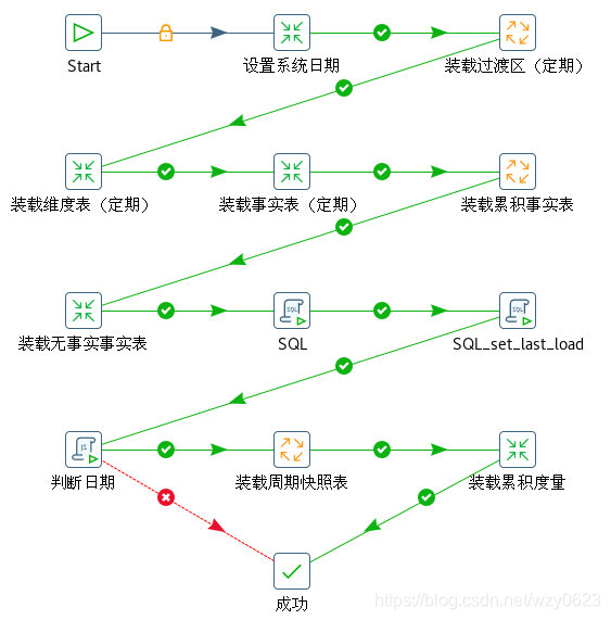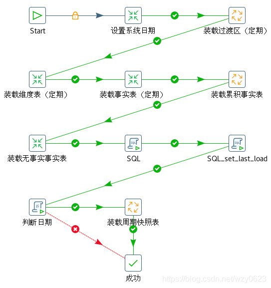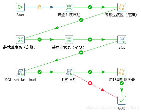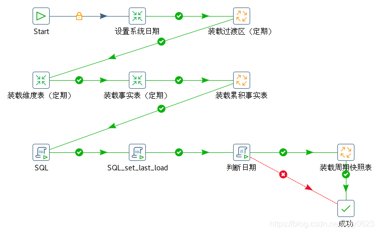 当日期等于12时,JavaScript作业项返回true,执行其后的“装载周期快照表”作业项,否则转到成功节点结束作业。“装载周期快照表”子作业调用图9-2所示的作业,执行完成后转到成功节点结束。很明显,本例中“判断日期”的作用就是控制在并且只在一个月当中的某一天执行周期快照表的数据装载,其它日期不做这步操作。这里的n==12只是为了方便测试,因为SQL中是以上个月的年月作为过滤条件,所以换做当月中任何一天都可以。这个作业保证了每月汇总只有在某天定期装载执行完后才开始,并且每月只执行一次。