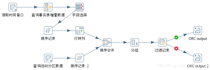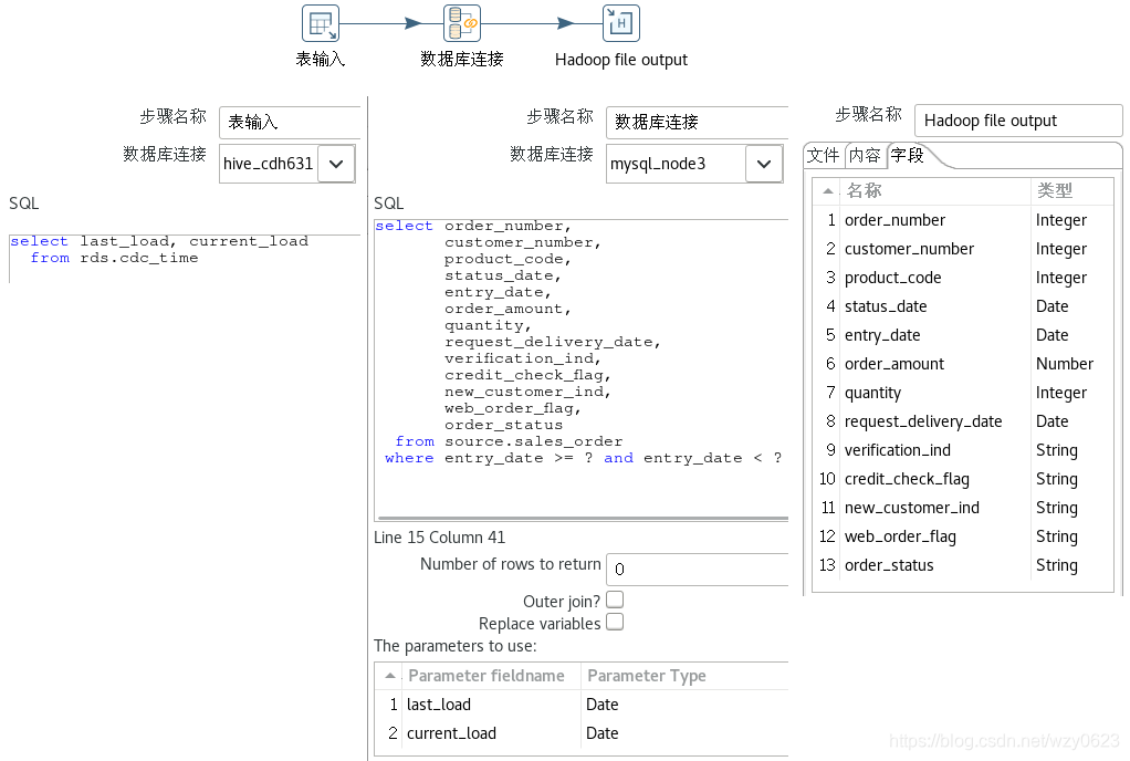 定期装载转换的步骤和初始装载一样,只需要做两点修改。其一是表输入步骤的SQL改为: