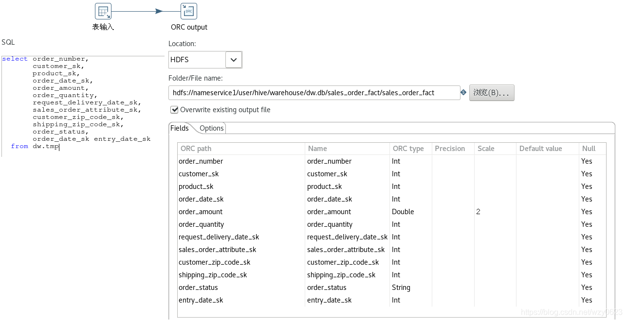 子查询将累积度量表和月周期快照表做并集操作,增加上月的累积数据。最外层查询执行销售数据按月和产品的分组聚合。最内层的case语句用于在每年一月时重新归零再累积。第二个修改点是将“Hadoop file output”步骤输出的文件名中加上年月值:month_end_balance_fact_${YEAR}${MONTH}。