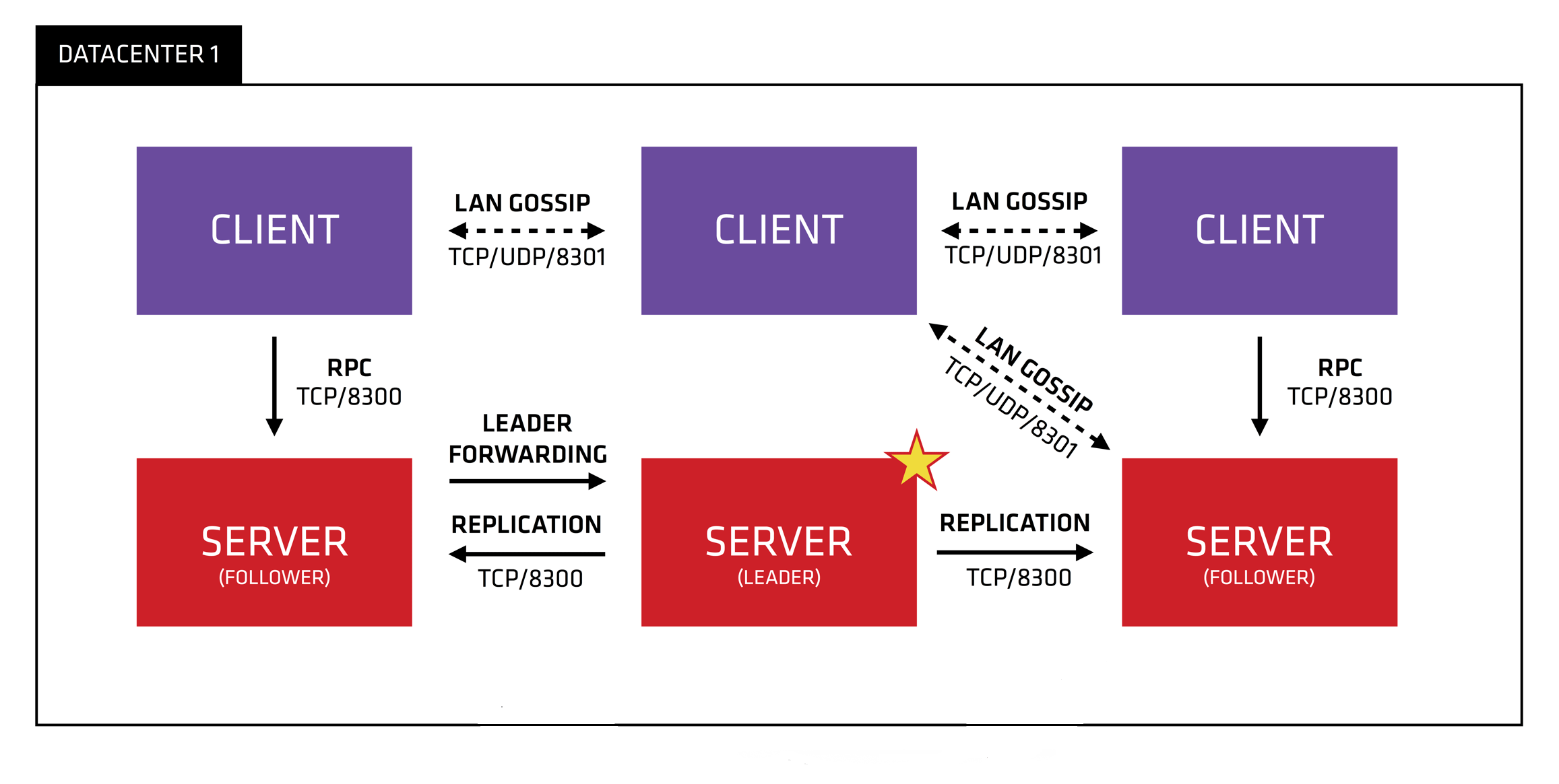 Server-Leader :表示这个 Server 是它们的老大,它和其它 Server 不一样的一点是,它需要负责同步注册的信息给其它的 Server 节点,同时也要负责各个节点的健康监测。如果 Leader 宕机了,通数据中心的所有 Server 内部会使用