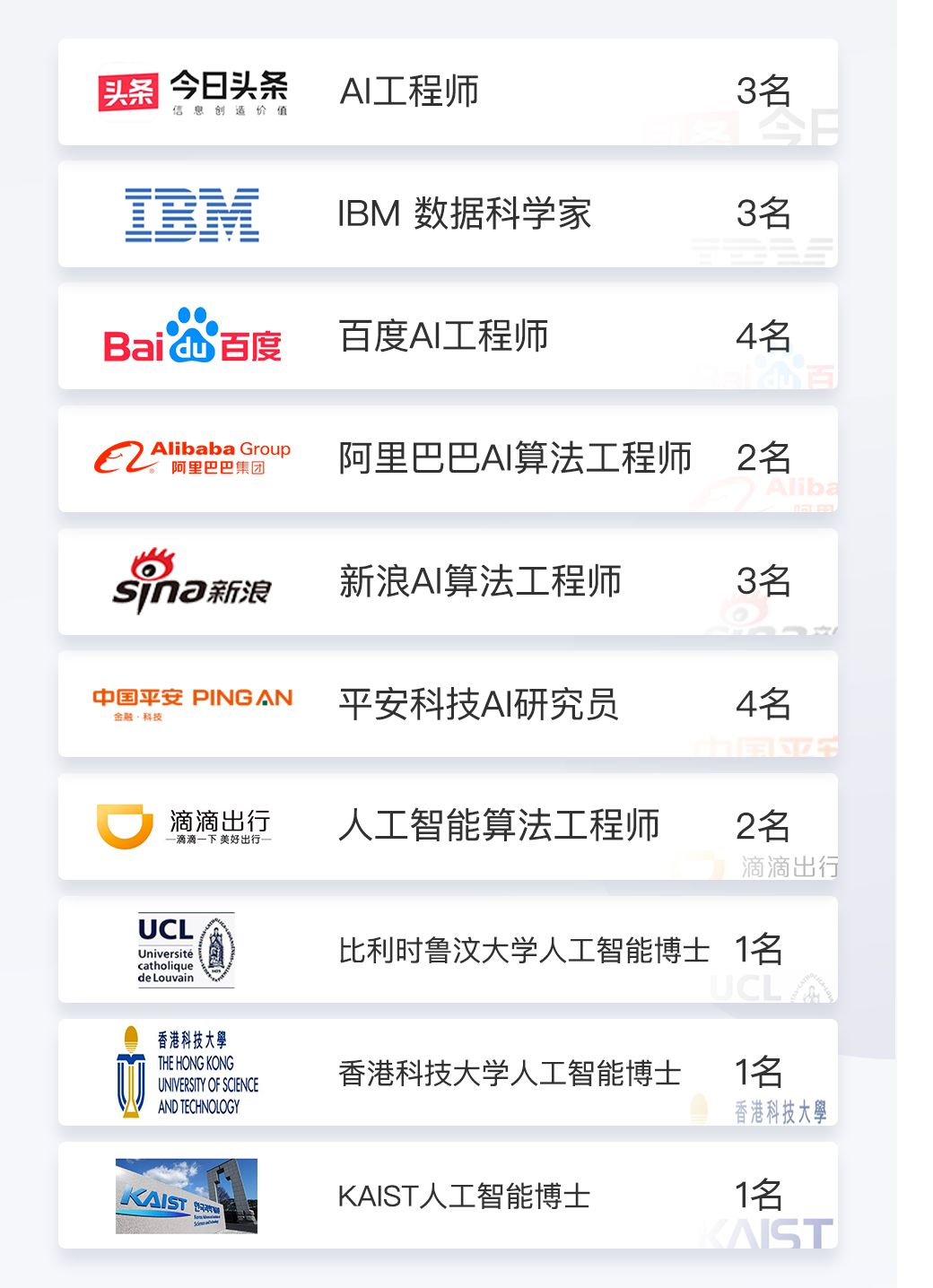 自2017年本AI课程招生开始,连续四期,累计培养近千名学员,其中前三期(第四期还未毕业)80%的同学拿到了offer,其中不乏国内外知名企业的算法岗位或者国外名校的AI Phd,Master的offer。下图所列举校友资源仅为第四期部分学员。