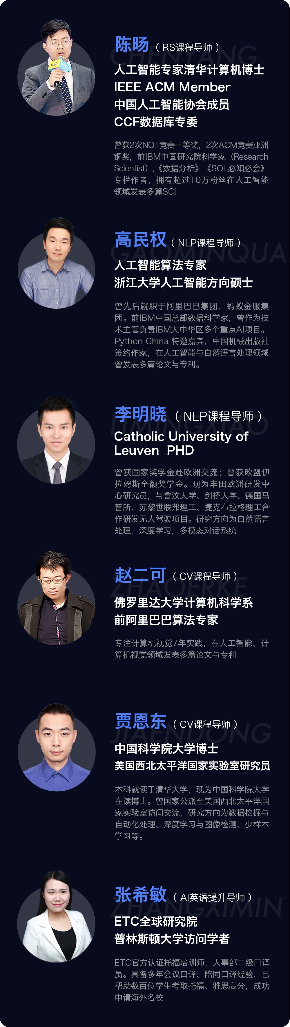 本课程的老师,均来自国际名校(清华大学、佛罗里达大学、浙江大学)且均具备世界知名企业(阿里巴巴、商汤科技、IBM中国实验室)的实际工作经验。我们相信,唯有真正的资深老师 + 良好的表达传授能力,才能给同学们真正的知识。同学们学到的,不仅仅是AI知识,更是一种学习习惯、思维方式和对世界的认知。