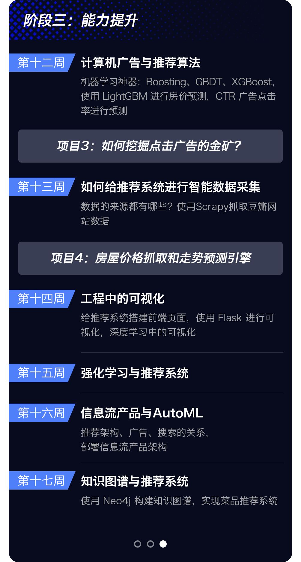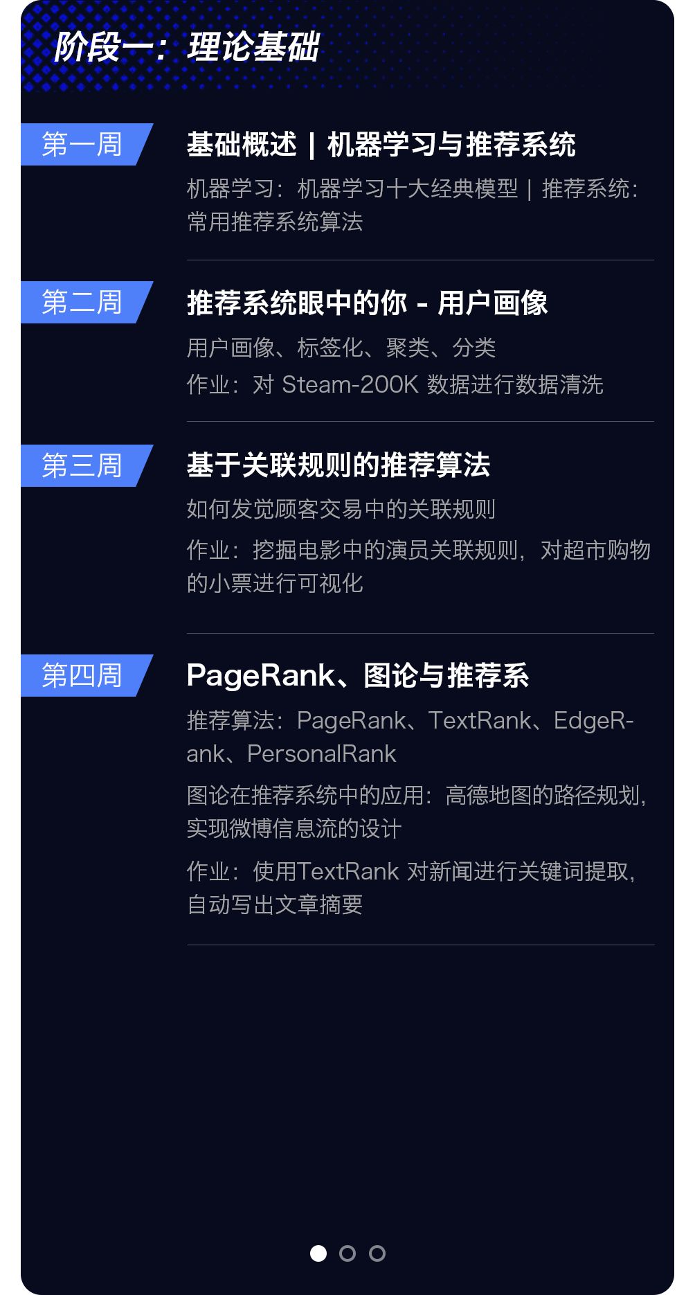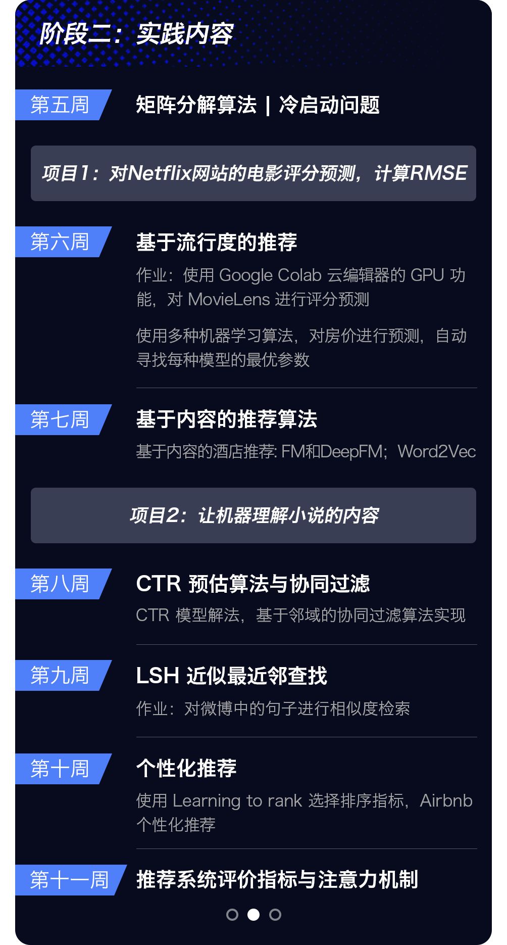推荐系统(Recommender System,RS)方向,主要面向希望从事数据挖掘,推荐系统工程师相关的学员。推荐系统目前主要用于解决筛选大量信息的问题,推荐的对象包括(图片、视频等)内容/商品/信息查询,也有一些推荐系统专门寻找人/服务/信息等对象。