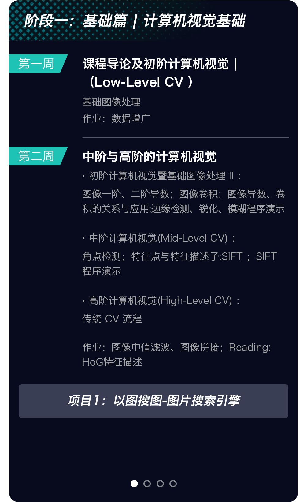 计算机视觉(Computer Vison,CV)主要面向希望从事图像智能处理与识别、视频检测、图像自动生成、无人驾驶、人脸识别与检测方向的学员。本课程内容主要涉及计算机视觉的深度学习方法,包括计算机图形学、经典计算机视觉中的重点方法,同时也覆盖了基于对抗生成网络(GAN)的图像生成方法。