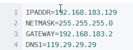 ONBOOT设置为yes,表示网卡随系统一同启动。BOOTPROTO用来设置网卡的启动类型,dhcp表示自动获取IP地址,static表示手动设置静态IP地址。IPADDR指定IP地址(IP地址取决于前面自动获取的地址),NETMASK指定子网掩码,GETWAY指定网关,DNS1指定上网用的DNS IP地址,这个119.29.29.29是国内DNSpod公司提供的一个公共DNS。完成以上的更改后,按一下Esc键,然后输入“:wq”并回车,退出刚才的文档。然后重启网络服务,运行如下命令