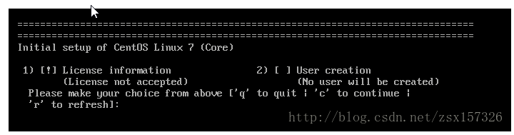 这里做一些初始化设置,比如要设置一个普通用户,目的是为了拿这个普通用户登陆图形界面。在它的提示下边,输入数字1并回车,将出现License information,其中有两个选项,1表示阅读这个许可,2表示直接同意这个许可。我们输入数字2并回车,再输入字母c继续。此时又再次跳出之前的Initial setup界面,和之前的变化是,第1项多了一个[x],这表示这一项我们已经设置过了。