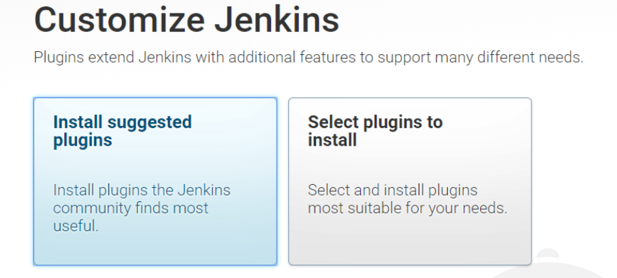出现如下界面,选择需要安装的插件,jenkins本身很小,它是基于插件的,可以点击“建议安装的插件”或"选择插件安装",这里我选择的是建议安装的插件: