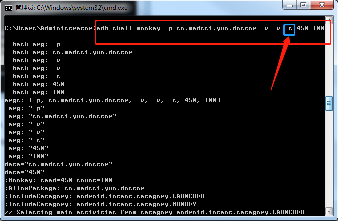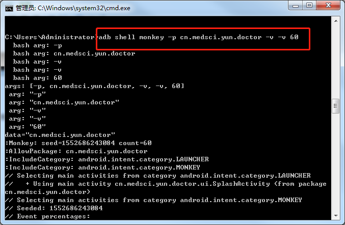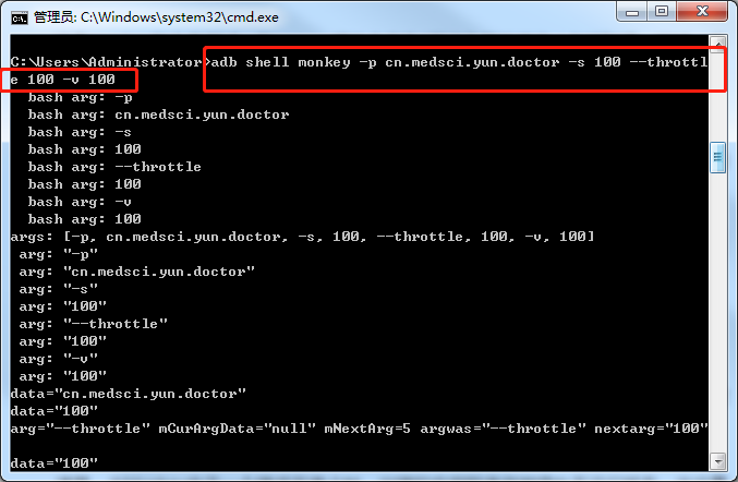 如上命令含义解读:测试的应用程序为医咖大夫,种子seed的值为100,事件间的延时为100毫秒,一个-v表示输出的monkey的log较为详细的数据,测试事件次数100,