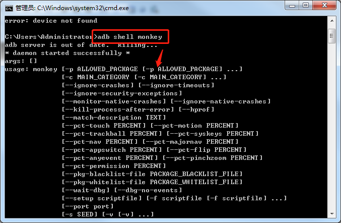 3.执行mokey测试前,先看下有哪些参数,执行命令【adb shell monkey】
