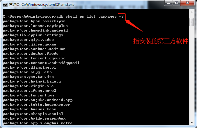 2.其中程序包名称通过adb shell pm list packages -3显示所有第三方APP程序包