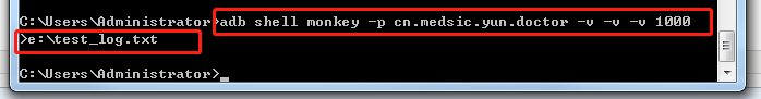 如上命令含义:测试的应用程序为医咖大夫,三个-v表示输出的monkey的log最详细的数据,测试事件次数1000,log保存在E盘的test_log.txt里面