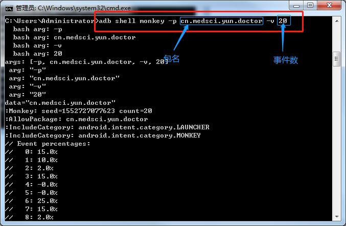 打开cmd-输入命令【adb monkey -p cn.medsci.yun.doctor -v 次数】,如下图所示