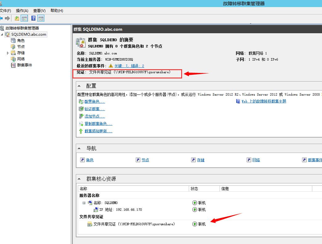 如果集群节点跟见证共享文件夹不能通信,例如 域控关机了,到达一定时间,在服务器管理器面板里角色和服务器组会显示红色