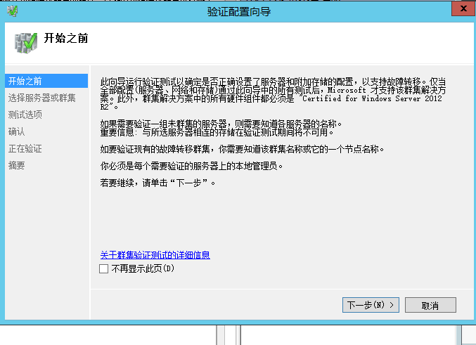 5、在验证配置向导中最好选择运行所有测试,进行全部检测就可以查看到服务器之间建立群集的所有设置,包括网络、共享磁盘、操作系统等。