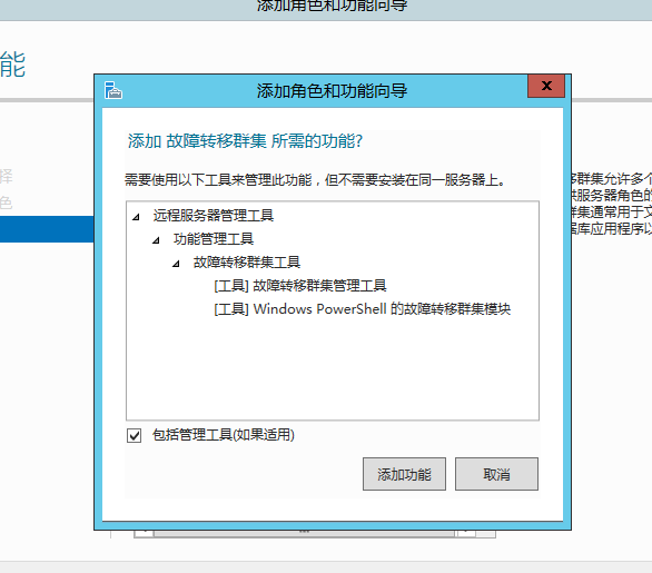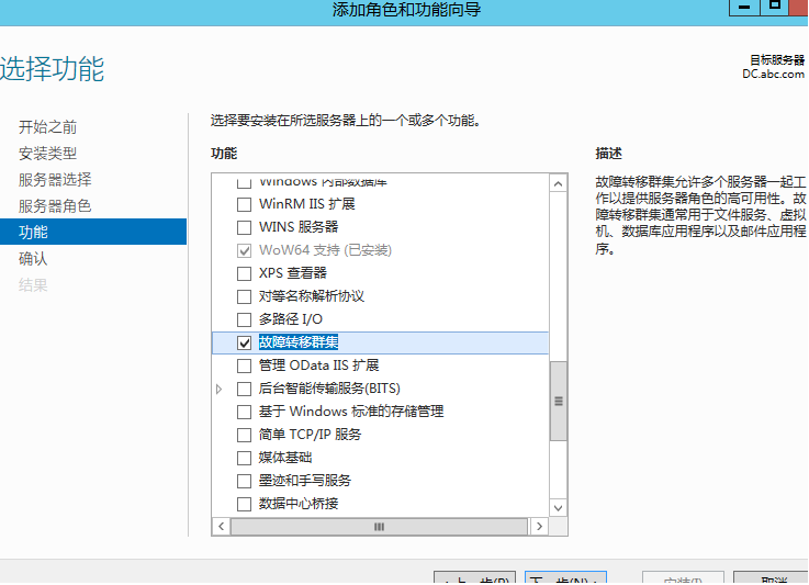 1、 安装故障转移集群,两个节点都同时安装故障转移集群服务