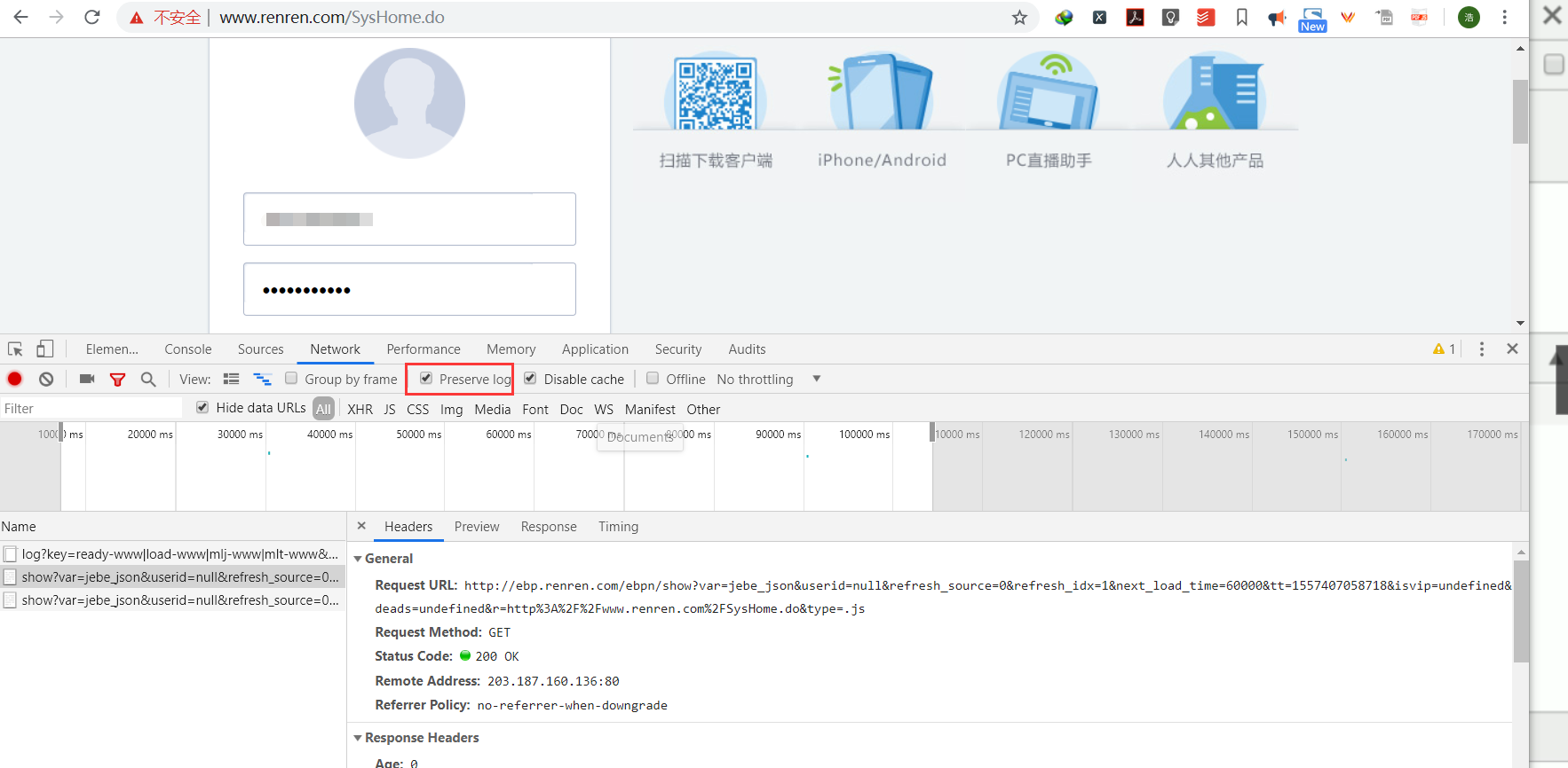 点击登录会进行页面跳转,Preserve log选项,这个选项是保留跳转与跳转之前所有记录