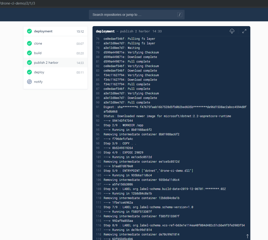 都准备好之后就可以提交代码了,代码提交之后drone立即就开始干活了。第一次build需要很长时间,因为用到了microsoft/dotnet这个镜像,build阶段可以用更小一点的镜像替换掉。