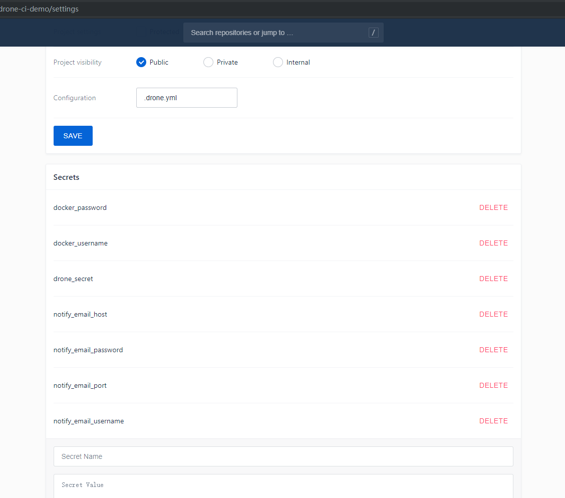 写好.drone.yml之后先不要急于提交,在drone项目仓库中启用drone-ci-demo,在settings中添加一些secrets,secret name就是上述.drone.yml中的from_secret。