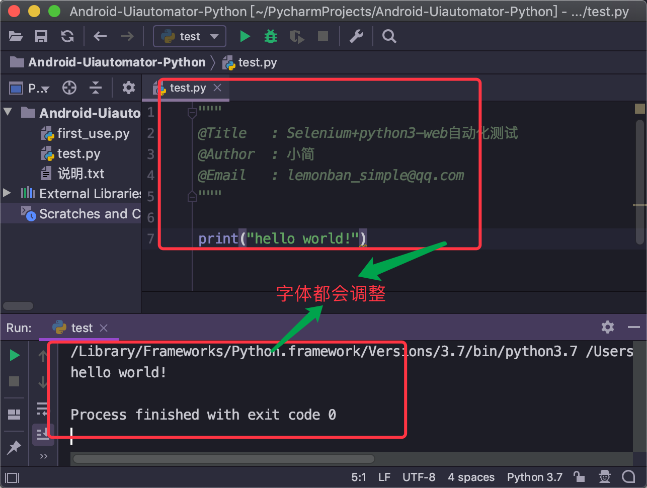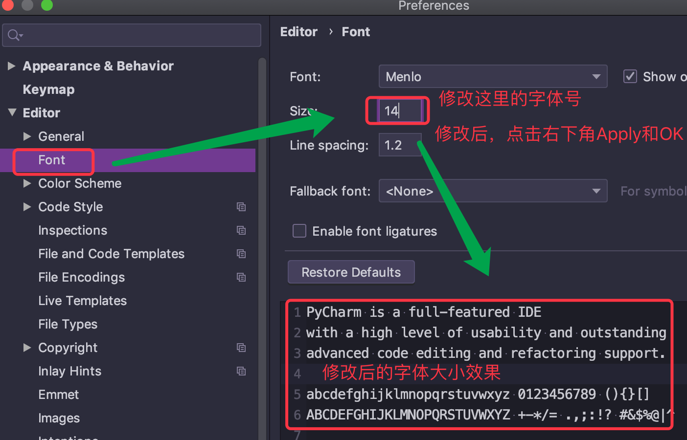 Mac: Pycharm - Preferences - Editor - Font