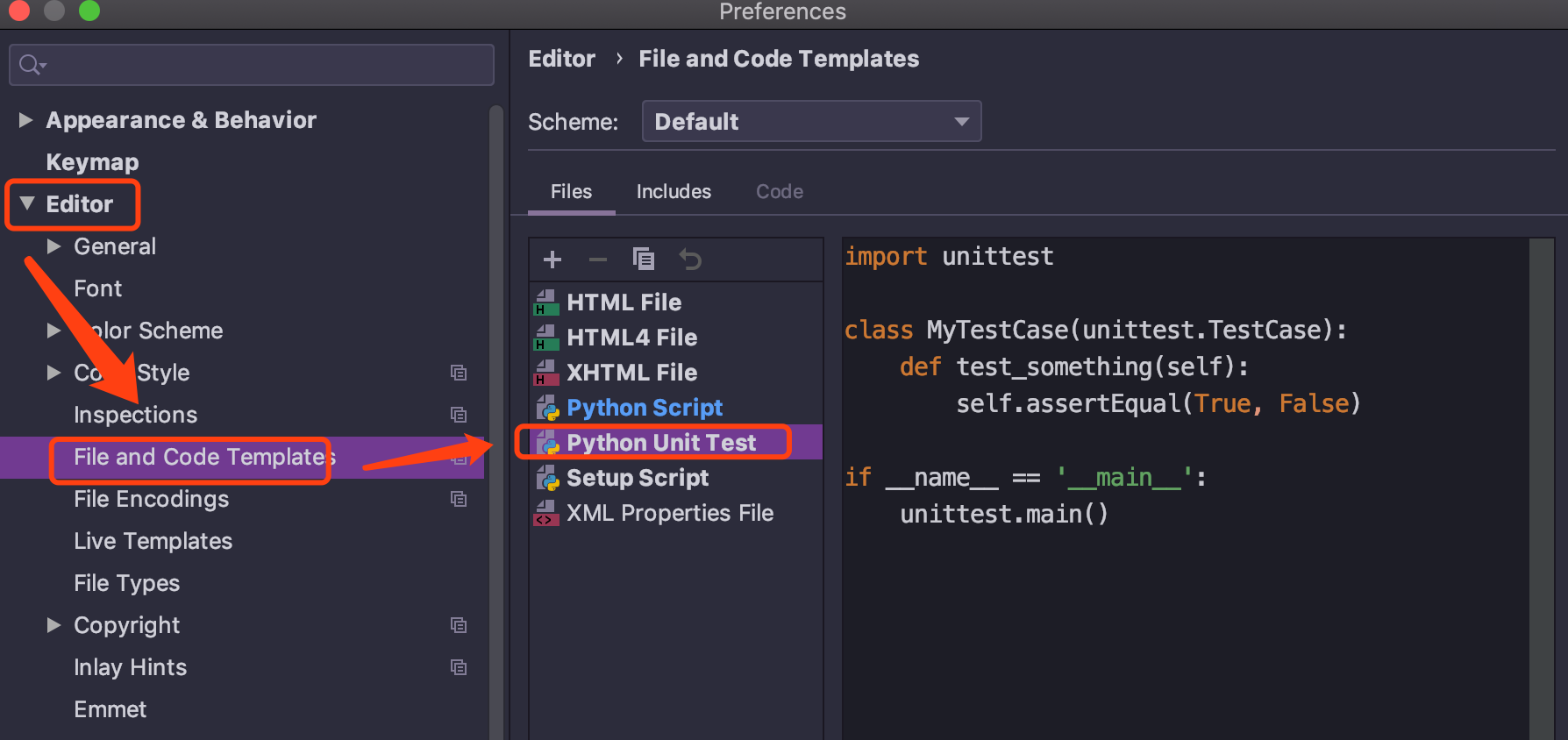 Mac: Preferences - Editor - File and Code Templates