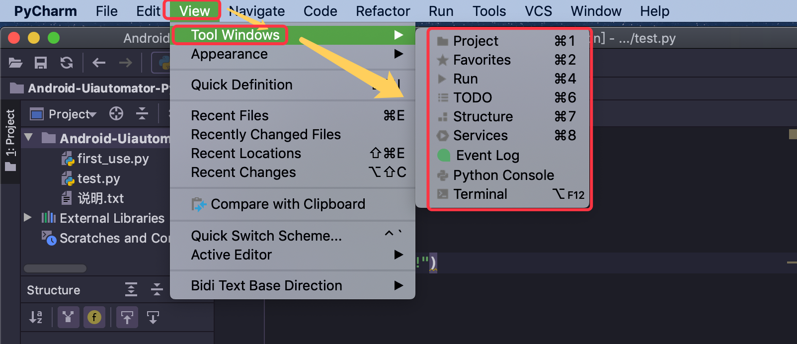 或者,希望显示其它的工具窗口,比如在pycharm当中显示终端命令行。