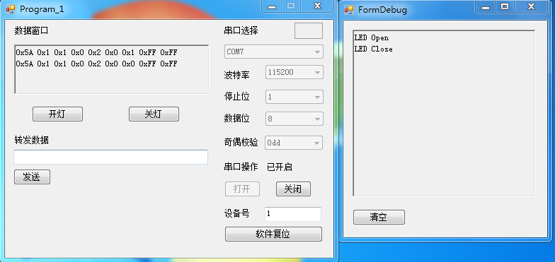 另外具体代码较多,详见对应工程usart.c和UsartProtocol.c文件。实现了协议并通过测试,下面就可以配合上位机软件实现远程点亮LED,如图所示