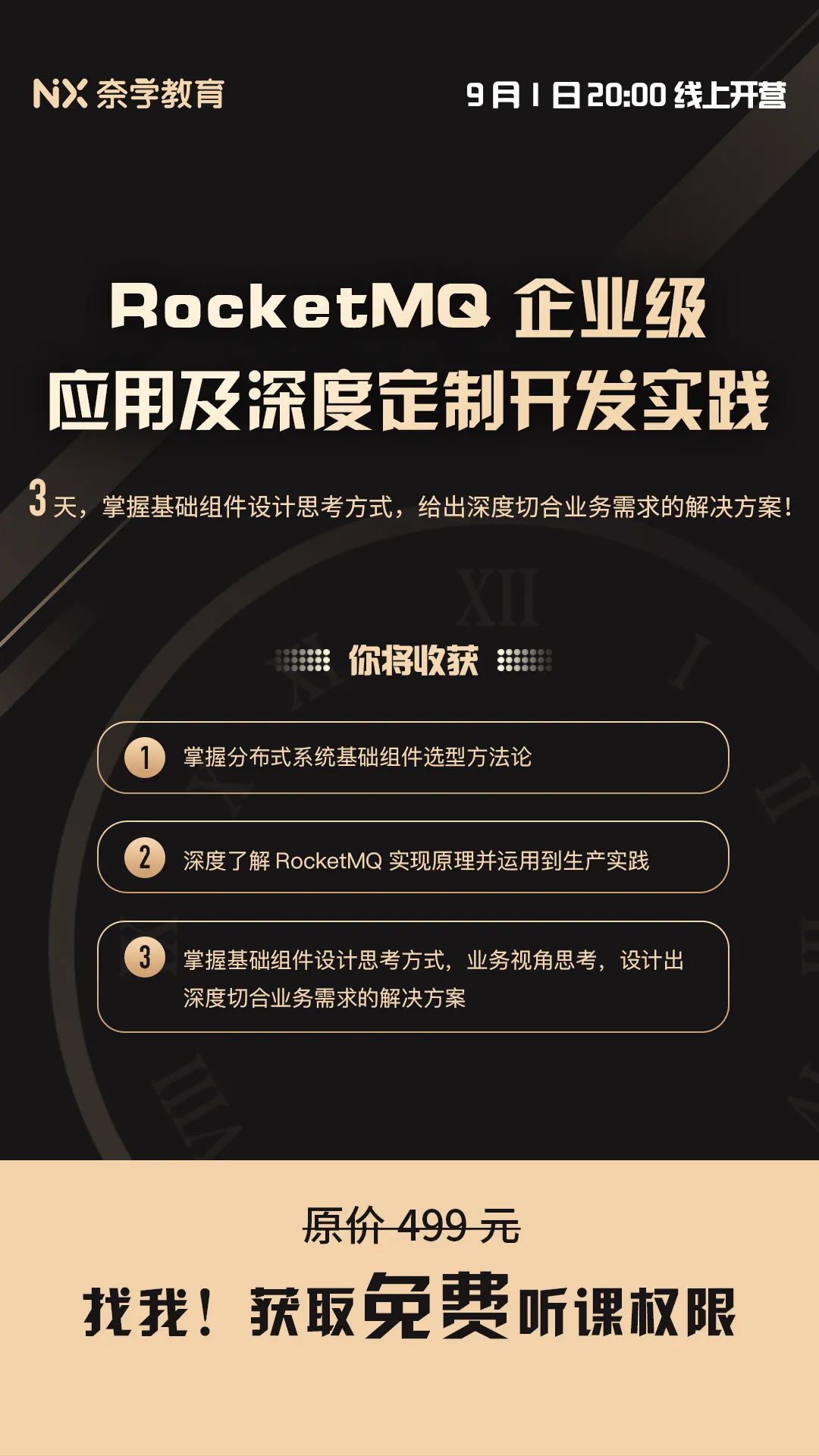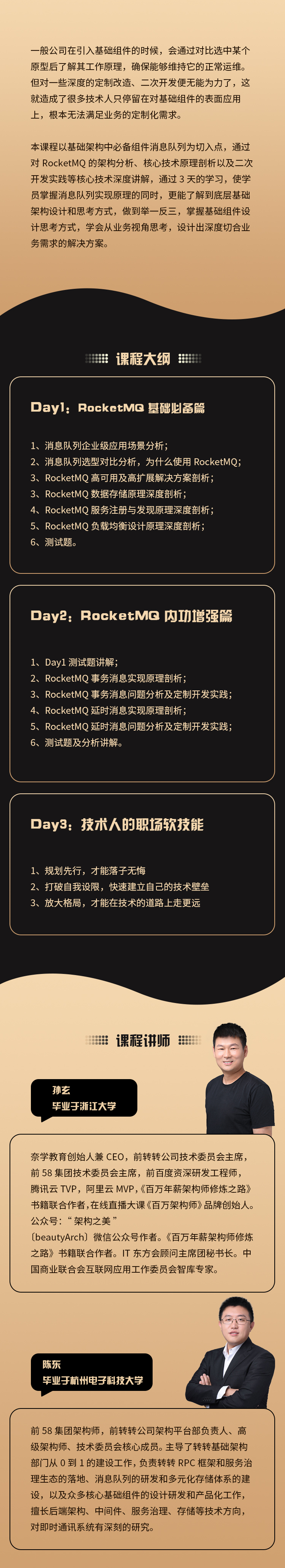 这门3天的训练营课程,以一线大厂的企业级真实案例为起点,以企业级基础架构中必备组件消息队列为切入点,通过对RocketMQ的架构设计分析、核心技术原理剖析、二次开发实践、企业级应用实践等核心技术深度讲解,通过3天的学习,使学员掌握消息队列实现原理的同时,更能了解到底层基础架构设计和思考方式,做到举一反三,掌握基础组件设计思考方式,学会从业务视角思考,设计出深度切合业务需求的解决方案。