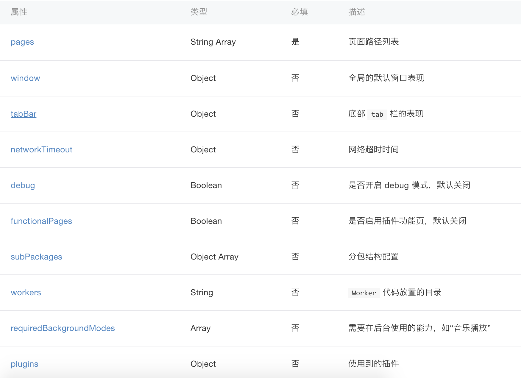 关于window及tabBar、networkTimeout等的配置,参考 全局配置