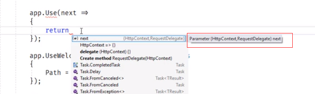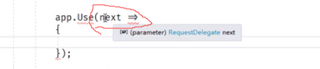 这个参数Func有个参数,我们叫它next,现在这个next就是RequestDelegate类型,RequestDelegate代表什么意思呢?