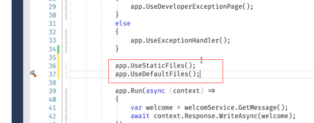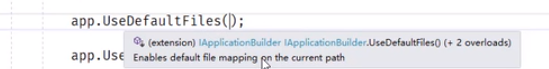 如果想使用其他的文件件名作为默认文件,可以在参数里面进行配置,注意这里是UseDefaultFiles()这个中间件