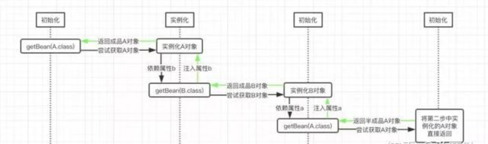 Spring先是用构造实例化Bean对象,此时Spring会将这个实例化结束的对象放到一个Map(缓存)中,并且Spring提供了获取这个未设置属性的实例化对象引用的方法。 结合我们的实例来看,当Spring实例化了A、B、C后,紧接着会去设置对象的属性,此时A依赖B,就会去Map中取出存在里面的单例B对象,以此类推,不会出来循环的问题。