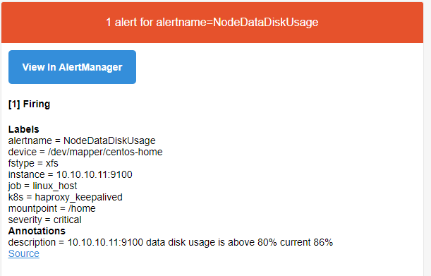 {{ define "wechat.default.message" }} {{ range .Alerts }} 告警状态: {{ .Status }} 告警类型:{{ .Labels.alertname }} 故障主机: {{ .Labels.instance }} 告警详情: {{ .Annotations.description }} 触发时间: {{ .StartsAt.Format "2006-01-02 15:04:05" }} {{ end }} {{ end }} - 其中 templates目录为自定义创建的