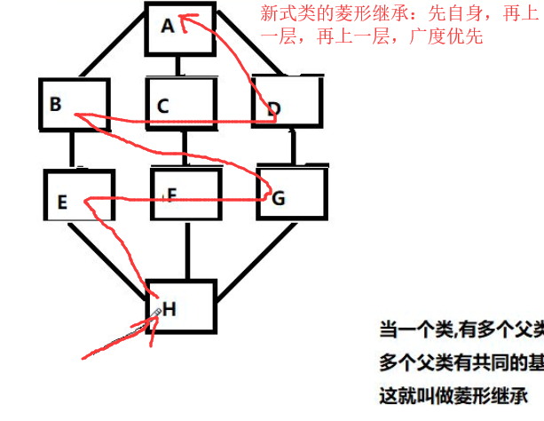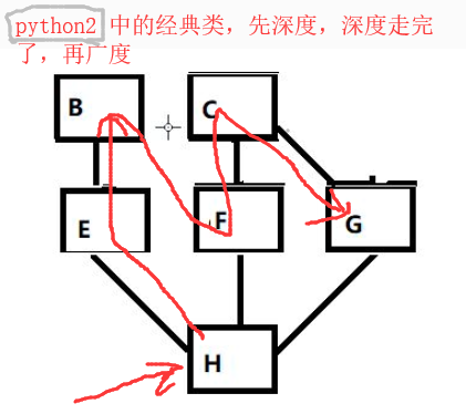# [H, E, B, F, G, C, object] ---> 上面的mro简化表示顺序(这是python3 的顺序)