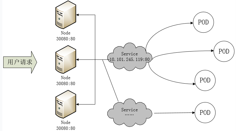 Kubernetes具有强大的副本控制能力,能保证在任意副本(Pod)挂掉时自动从其他机器启动一个新的,还可以动态扩容等,通俗地说,这个Pod可能在任何时刻出现在任何节点上,也可能在任何时刻死在任何节点上;那么自然随着Pod的创建和销毁,Pod IP 肯定会动态变化;那么如何把这个动态的Pod IP暴露出去?这里借助于Kubernetes的 Service 机制,Service可以以标签的形式选定一组带有指定标签的Pod,并监控和自动负载他们的Pod IP,那么我们向外暴露只暴露Service IP就行了;这就是NodePort模式:即在每个节点上开起一个端口,然后转发到内部Pod IP 上,如下图所示: