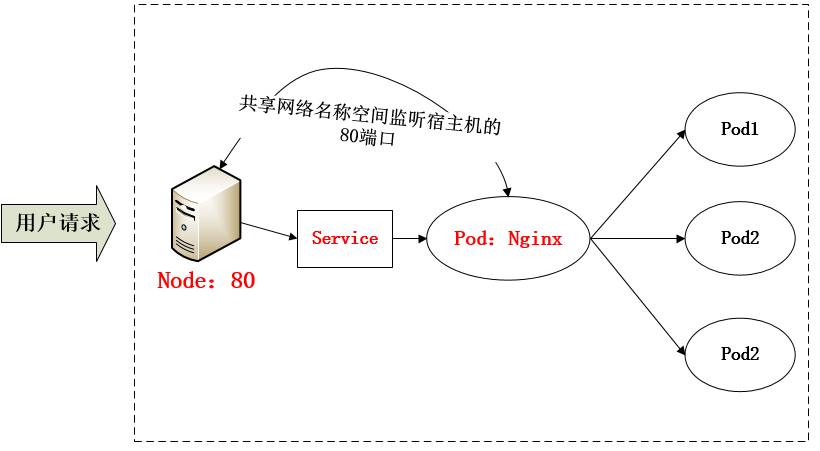 采用NodePort方式暴露服务面临的问题是,服务一旦多起来,NodePort在每个节点上开启的端口会及其庞大,而且难以维护;这时,我们能否使用一个Nginx直接对内进行转发呢?众所周知的是,Pod与Pod之间是可以互相通信的,而Pod是可以共享宿主机的网络名称空间的,也就是说当在共享网络名称空间时,Pod上所监听的就是Node上的端口。那么这又该如何实现呢?简单的实现就是使用 DaemonSet 在每个Node上监听 80,然后写好规则,因为Nginx外面绑定了宿主机80端口(就像NodePort),本身又在集群内,那么向后直接转发到相应 Service IP 就行了,如下图所示: