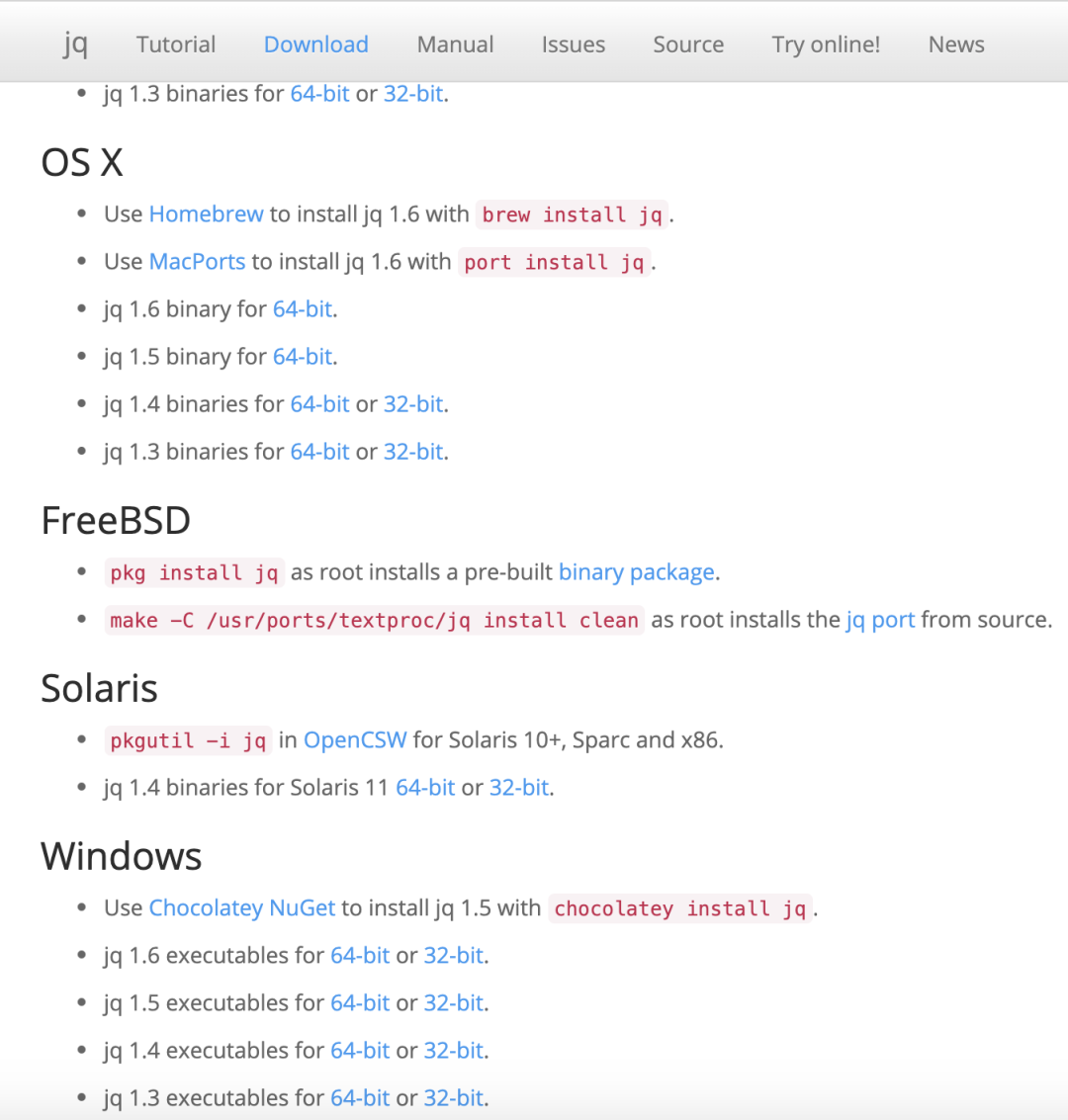 其他系统:jq 的官网很贴心,给出了各个系统的下载方式及其相关所需下载工具的链接,具体的就查看官网吧,链接如下