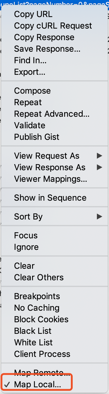 说了这么多“废话”,总算是到了主角了,其实数据准备好了,工具的使用还是很简单的,Charles有一个叫做Map Local的功能,在你要mock的请求上右击就可找到: