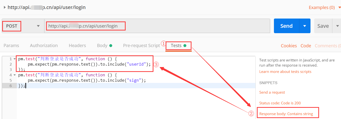 点击tests--->Responses body:contain string)--->修改test()的内容和include()的内容。