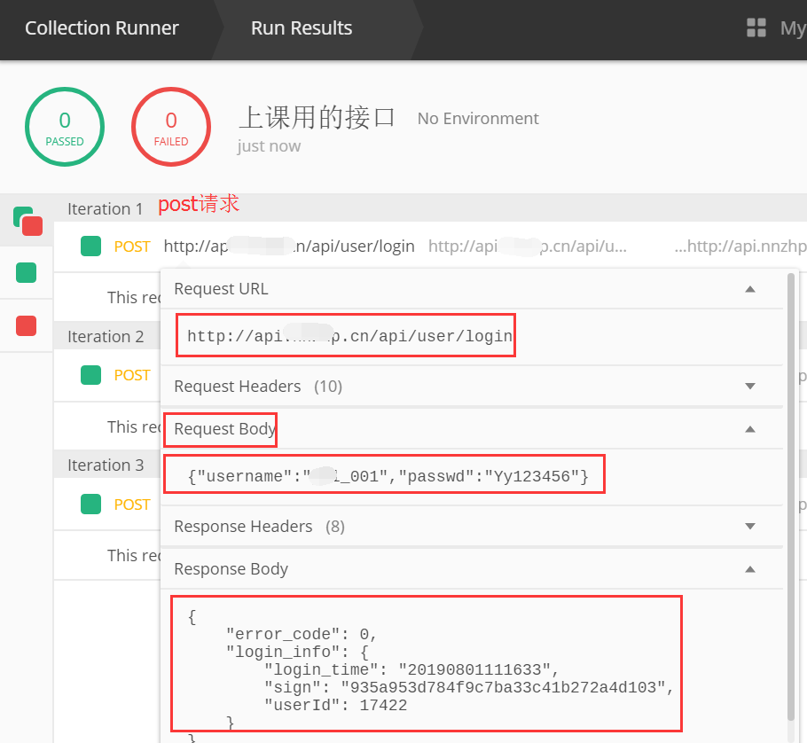 运行,如下图,共有3条登录请求,其中有2条是登录成功的,但是有1条是登录不成功的,因为账号密码错误。这里,我们需要手动查看每一条请求的成功与否,为了能实现自动校验结果,我们使用了postman来实现接口的自动化。