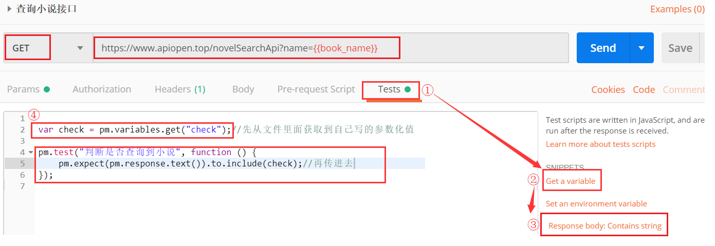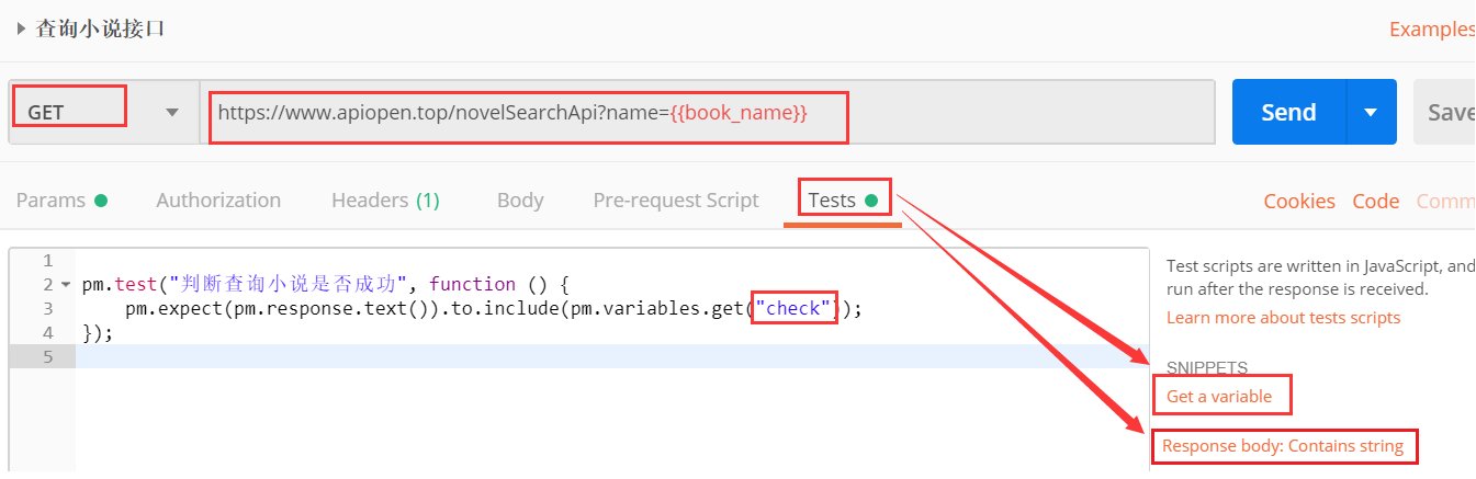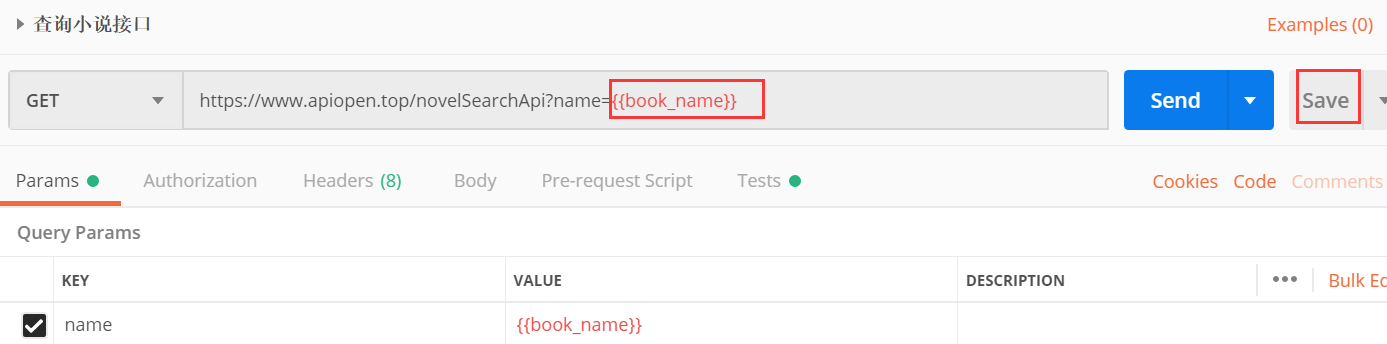 ②将url复制到postman上,考虑到各种场景的测试,url后面的name=盗梦笔记就使用变量来代替:https://www.apiopen.top/novelSearchApi?name={{book_name}}
