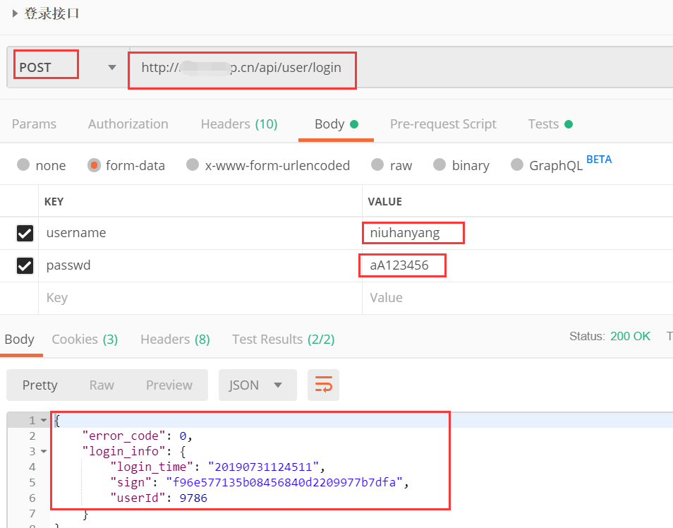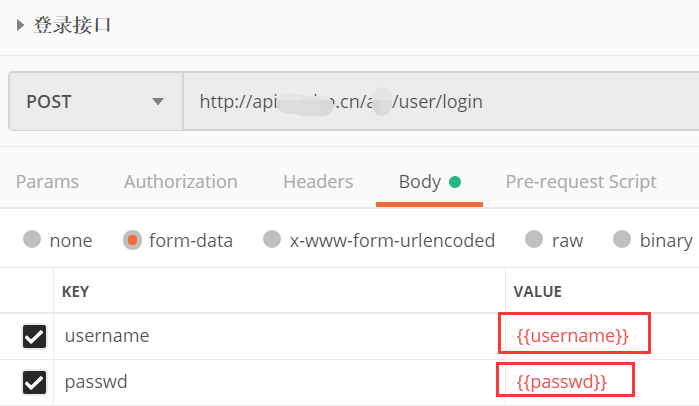 ①登录接口:填写URL,请求方法;在body-->form-data里面填写参数以及value,根据接口说明文档判断返回的对错。