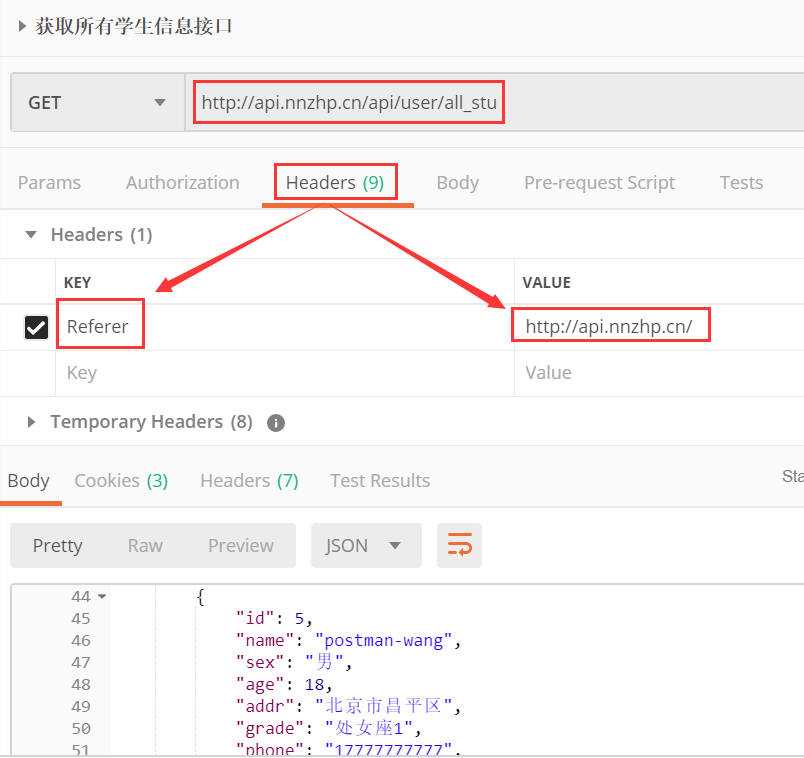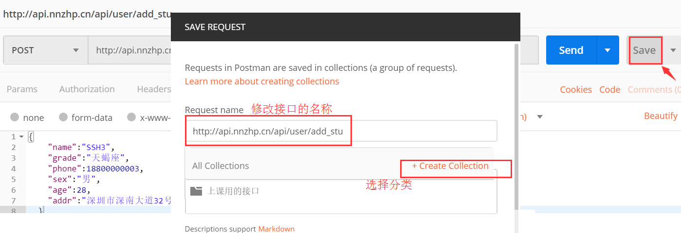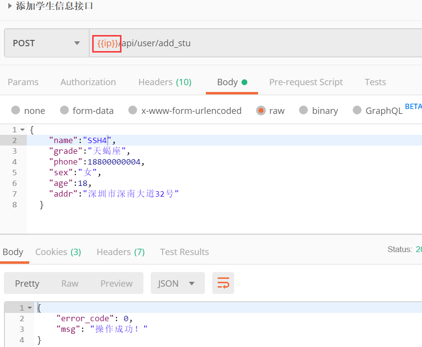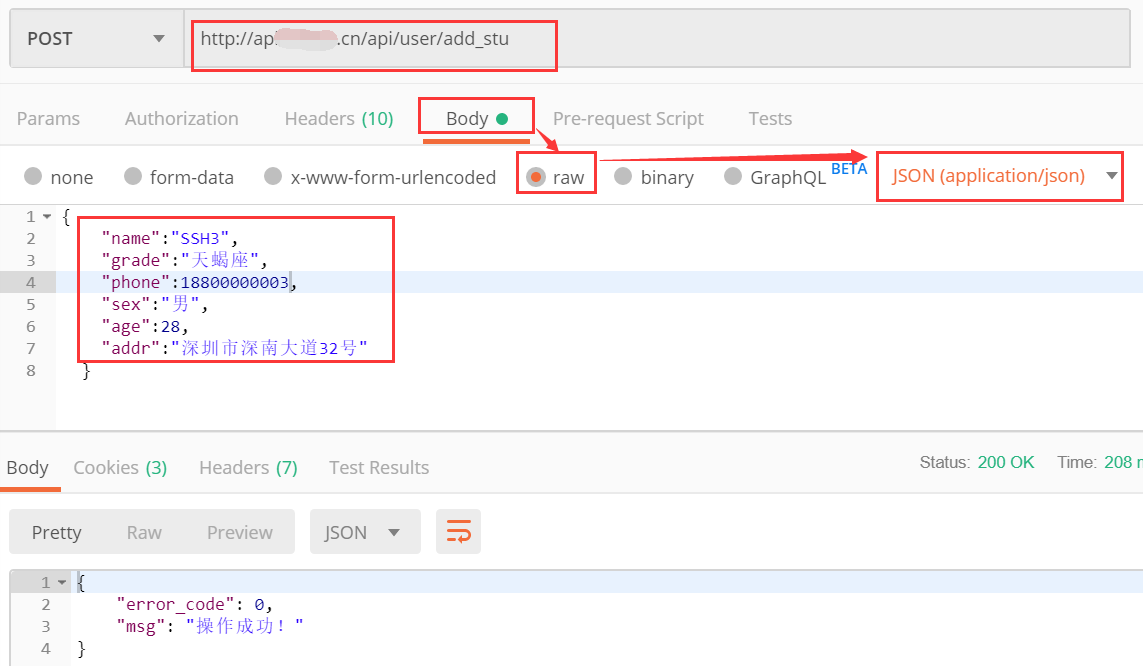 body--->raw---->json(application/json),将json串直接复制过来即可。运行成功后,使用查询学生接口查询是否能查到这个新添加的学生信息