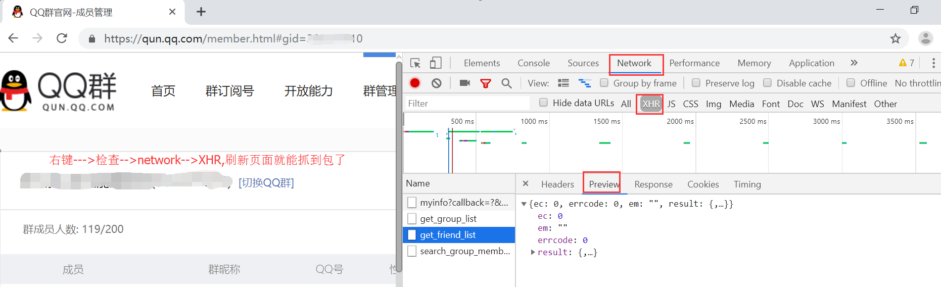 a.页面抓包:浏览器输入https://qun.qq.com/member.html,点击右键--->检查--->network--->XHR,然后刷新页面就能抓到包了。