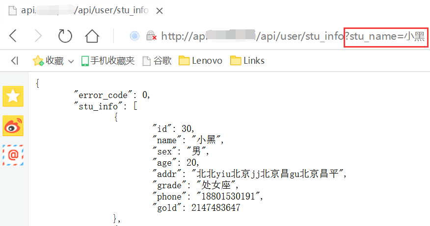 以上是单个参数的传参,如果是有多个参数的话,使用&来连接多个参数传参:url?name=小黑&sex=女&age=18